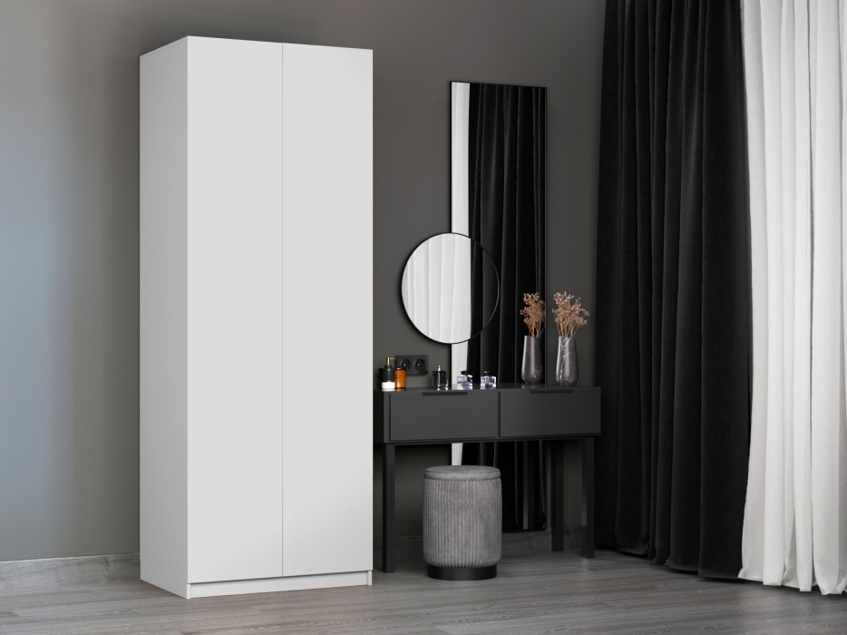 Благодаря надежным полкодержателям - штифтам, полки шкафа могут выдерживать до 15 кг. Шкаф оснащен долговечной, ударостойкой кромкой ПВХ, которая защищает его торцы от сколов и повреждений. Мебельные петли Titus B-Type обеспечивают открывание и закрывание двери под углом 110 градусов, а также предотвращают ее перекос. Наличие отдельного цоколя позволяет поставить шкаф вплотную к стене. Шкаф оснащен удобной минималистичной ручкой, изготовленной из алюминия.