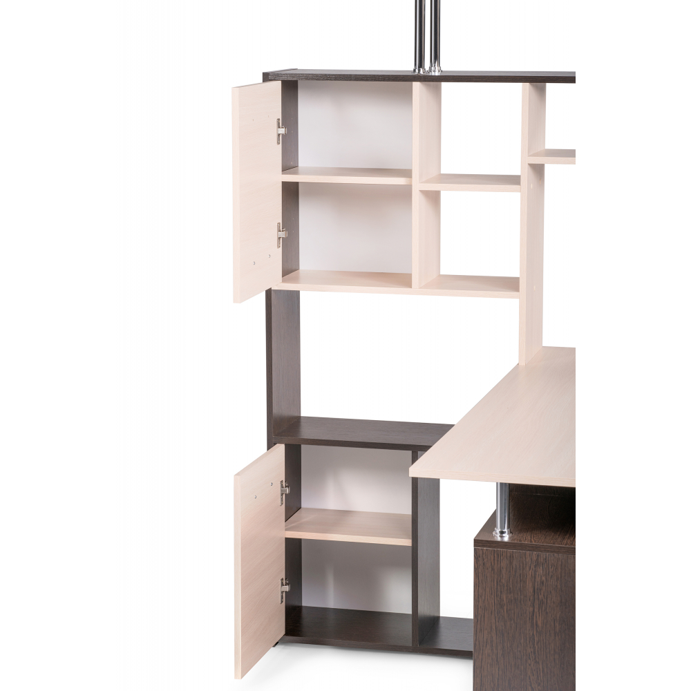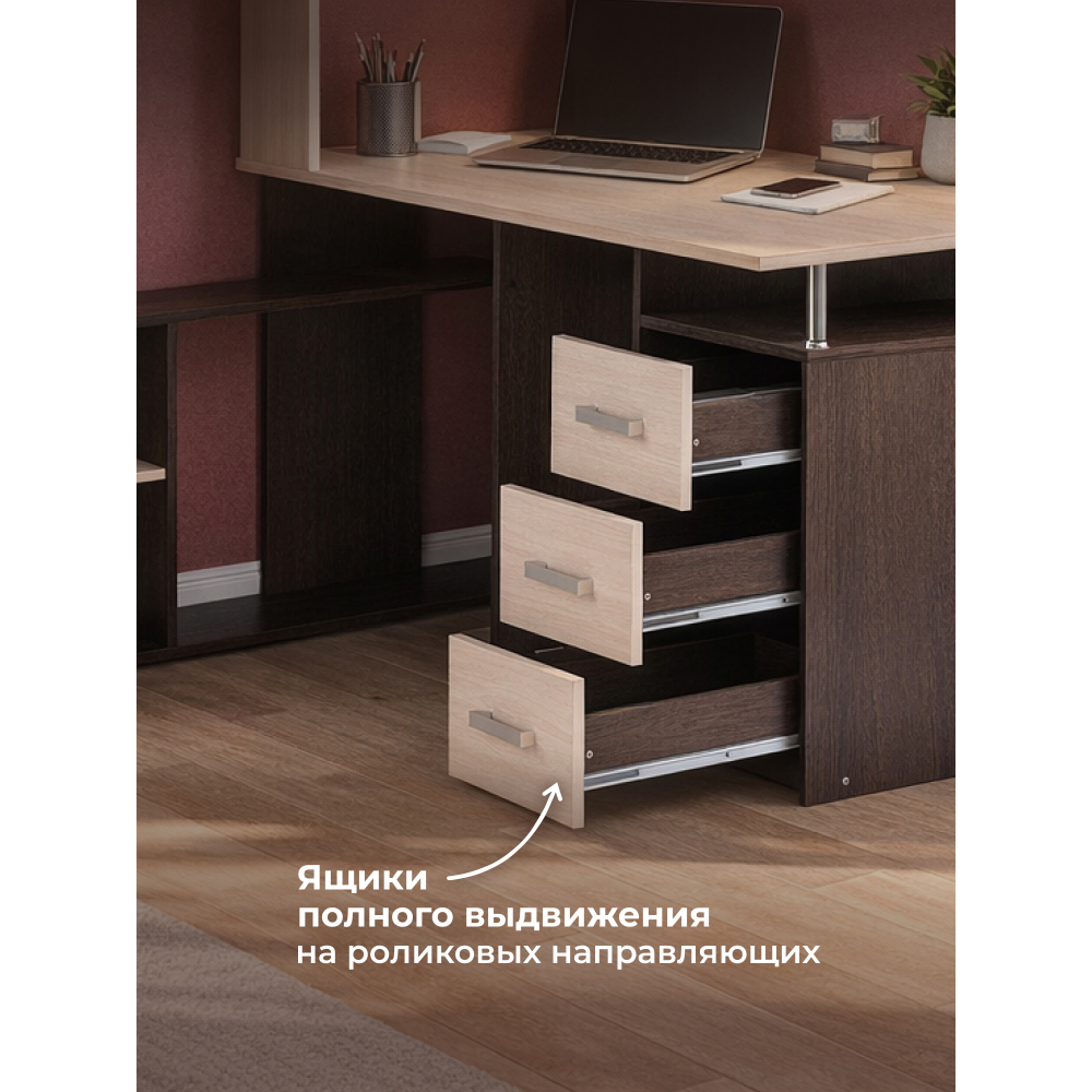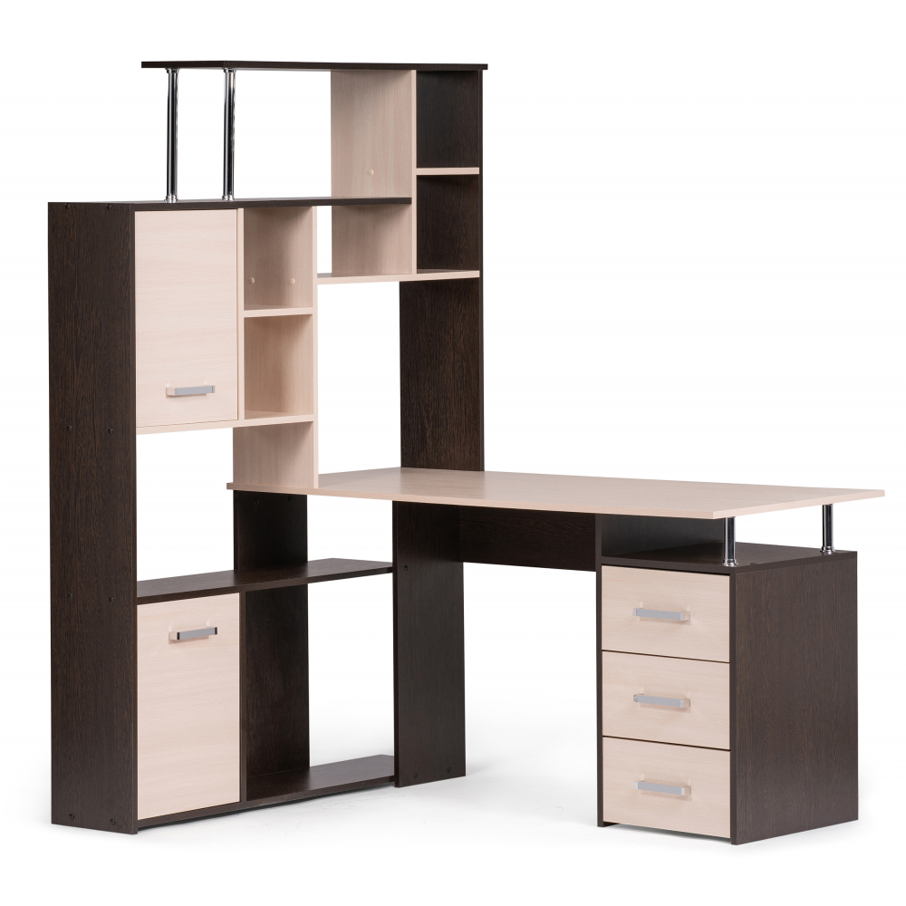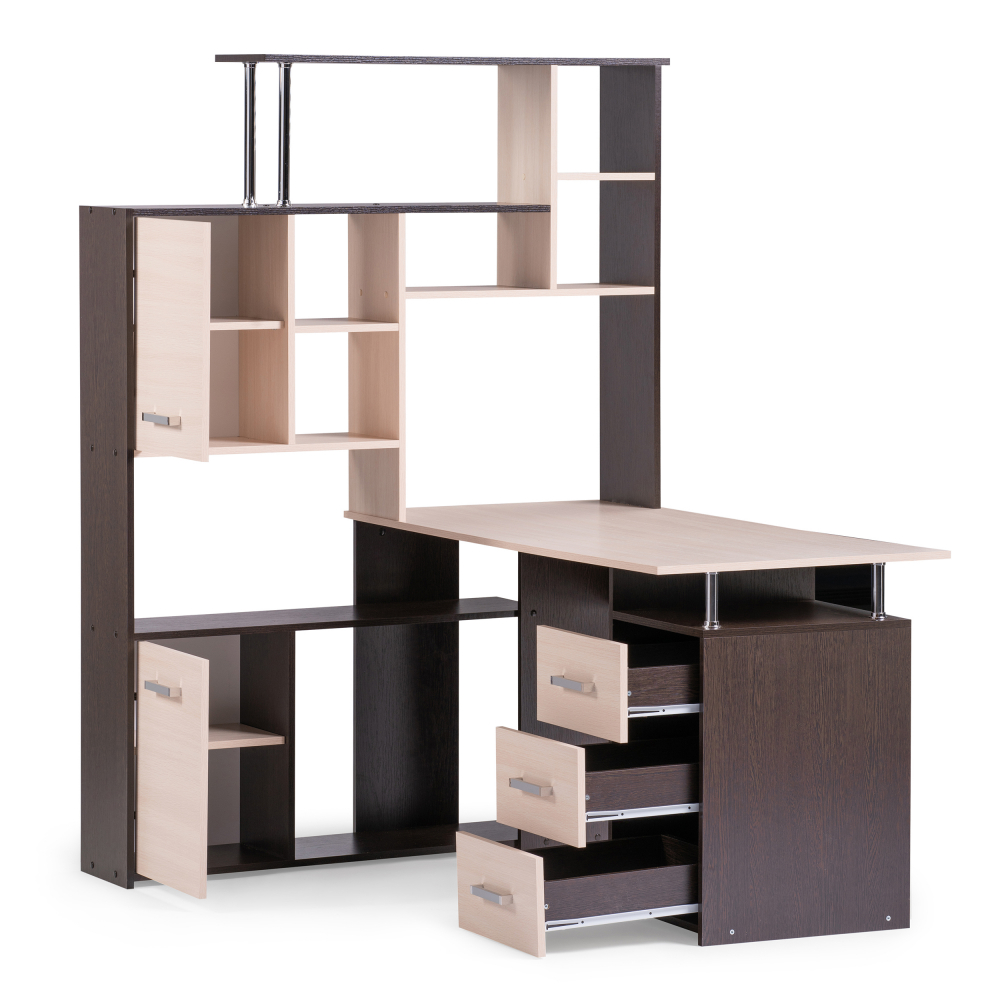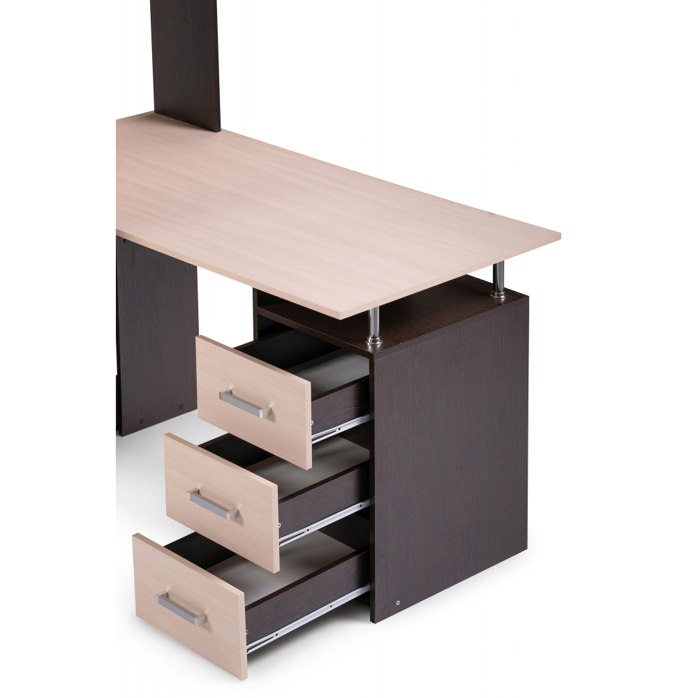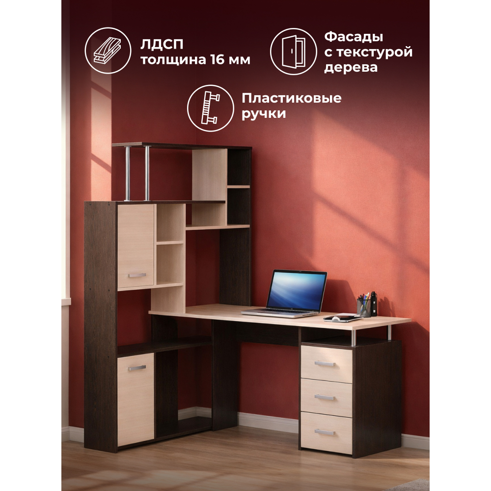 Стол КС-15 венге / дуб молочный левый; ЛДСП. Высота столешницы 75см. Рабочее место - 142х62см. Толщина ЛДСП - 16мм. Имеется 3 выкатных ящика на роликовых направляющих, 4 закрытых дверьми полки. Огромная вместительность для учёбы