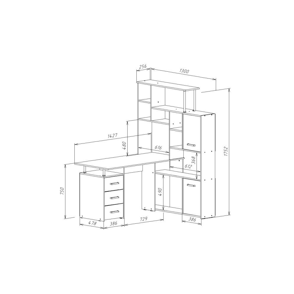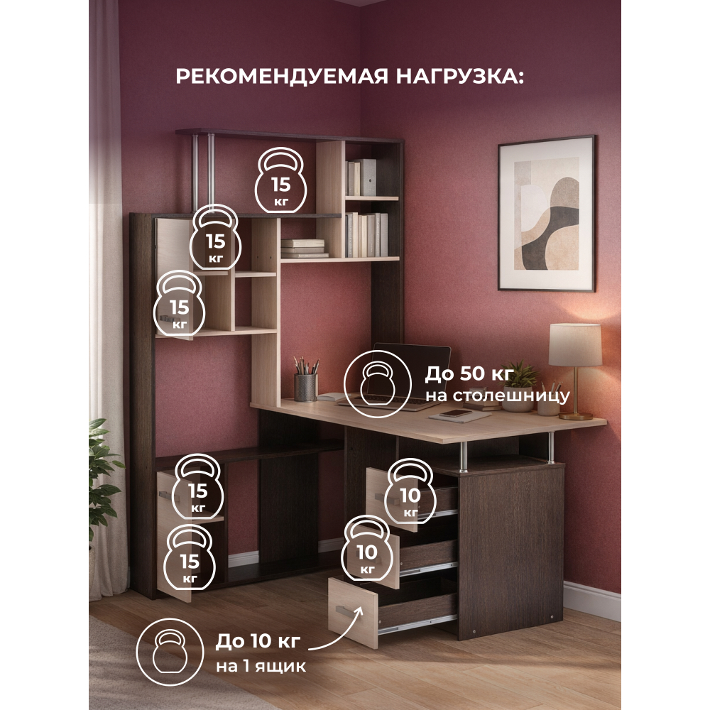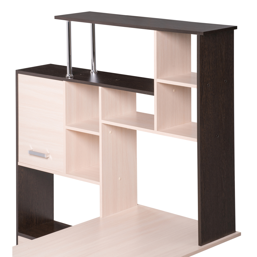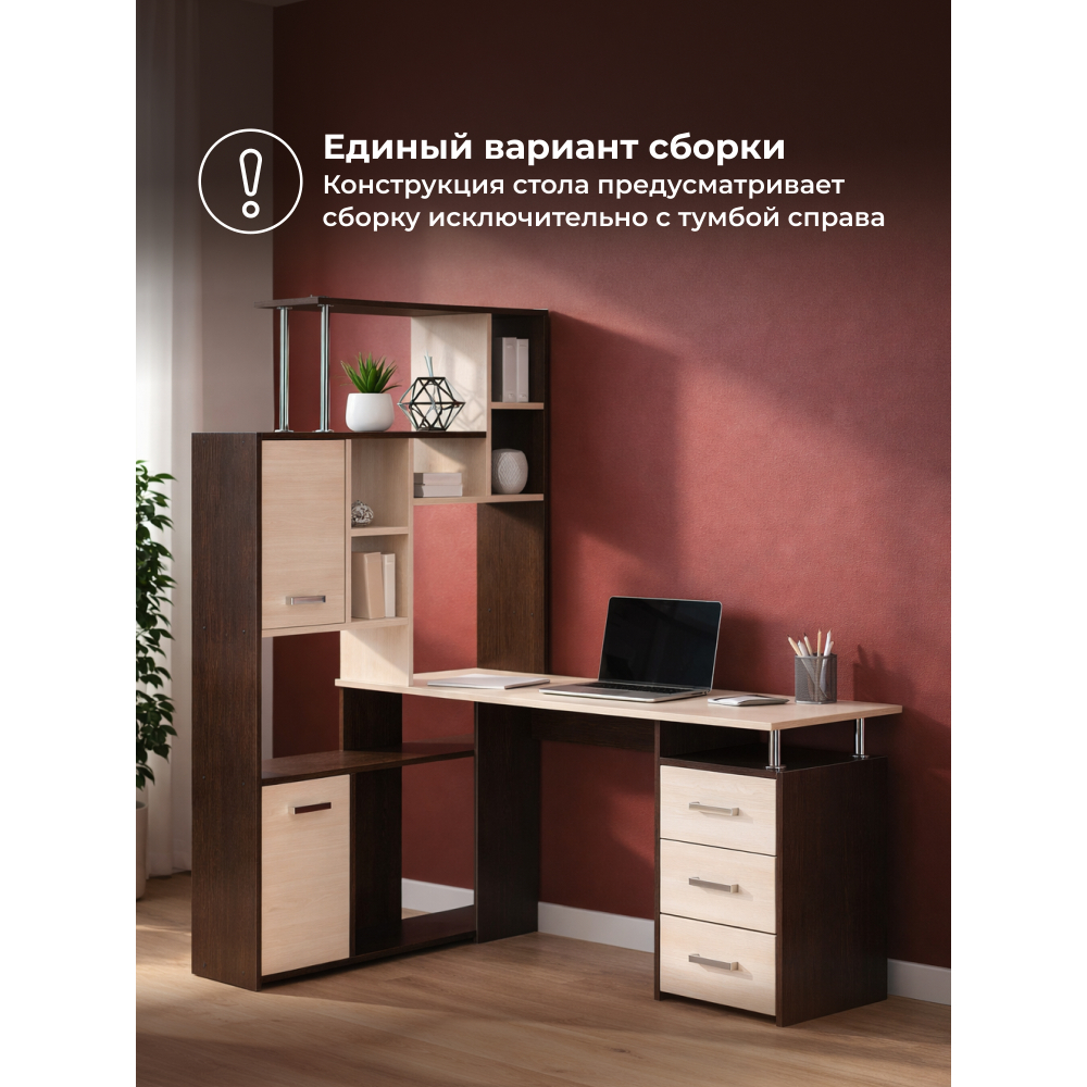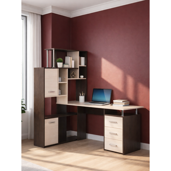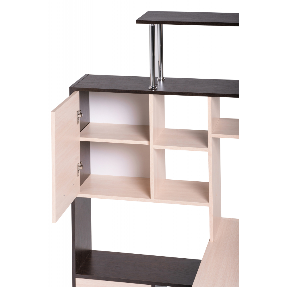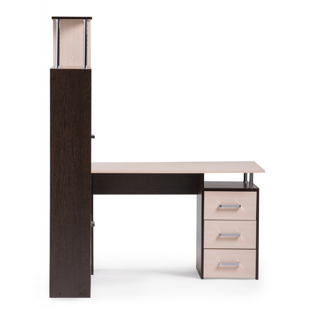 Стол КС-15 венге / дуб молочный левый; ЛДСП. Высота столешницы 75см. Рабочее место - 142х62см. Толщина ЛДСП - 16мм. Имеется 3 выкатных ящика на роликовых направляющих, 4 закрытых дверьми полки. Огромная вместительность для учёбы
